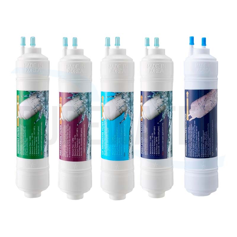 Set of 4 Cartridges (Sediment, pre-carbon, RO membrane and post-carbon) for drinking fountains or water purifiers.